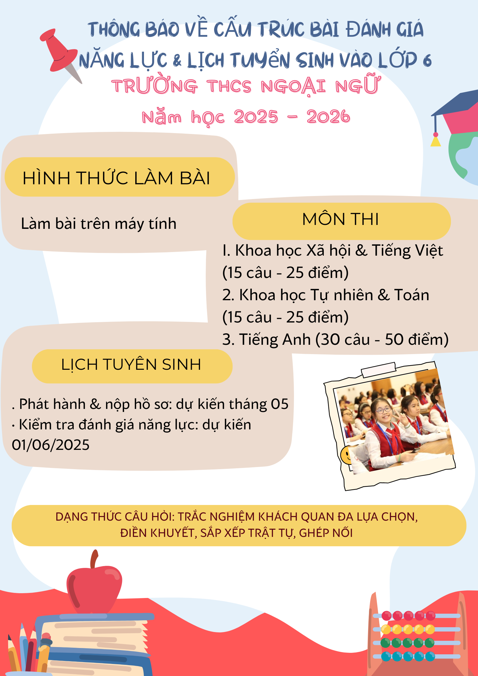 THÔNG BÁO VỀ CẤU TRÚC BÀI ĐÁNH GIÁ NĂNG LỰC & LỊCH THI VÀO LỚP 6 TRƯỜNG THCS NGOẠI NGỮ NĂM HỌC 2025-2026