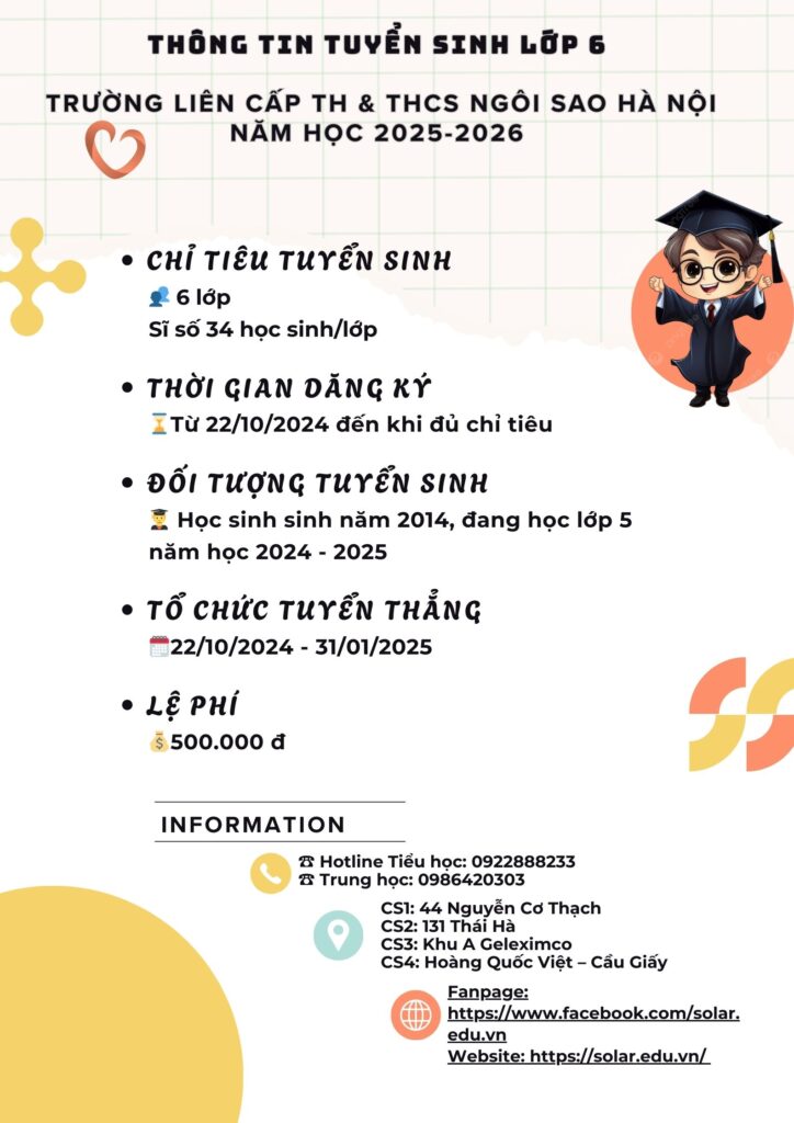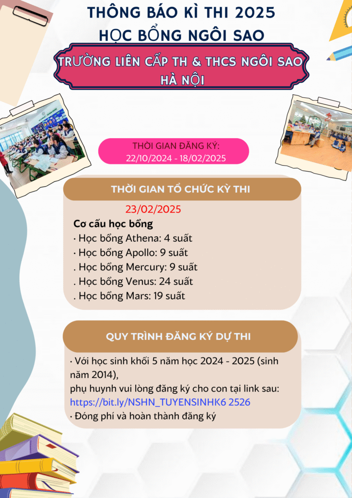 THÔNG TIN TUYỂN SINH LỚP 6 VÀ THÔNG BÁO KỲ THI HỌC BỔNG TRƯỜNG LIÊN CẤP TH & THCS NGÔI SAO HÀ NỘI NĂM HỌC 2025-2026